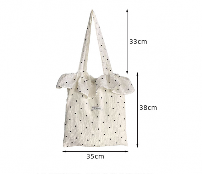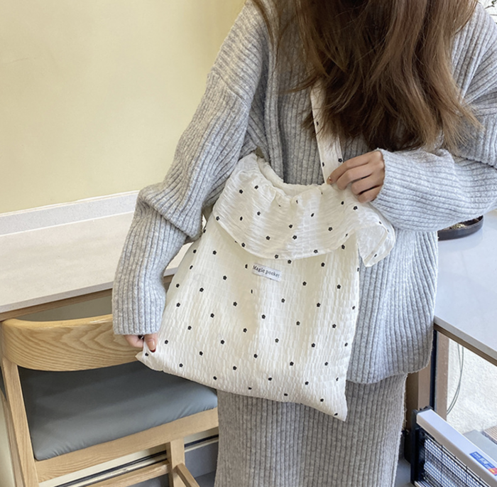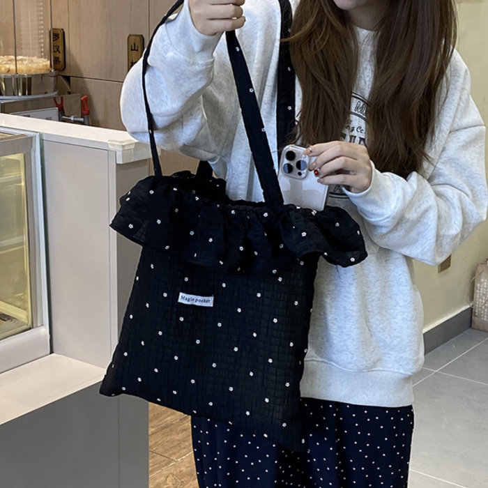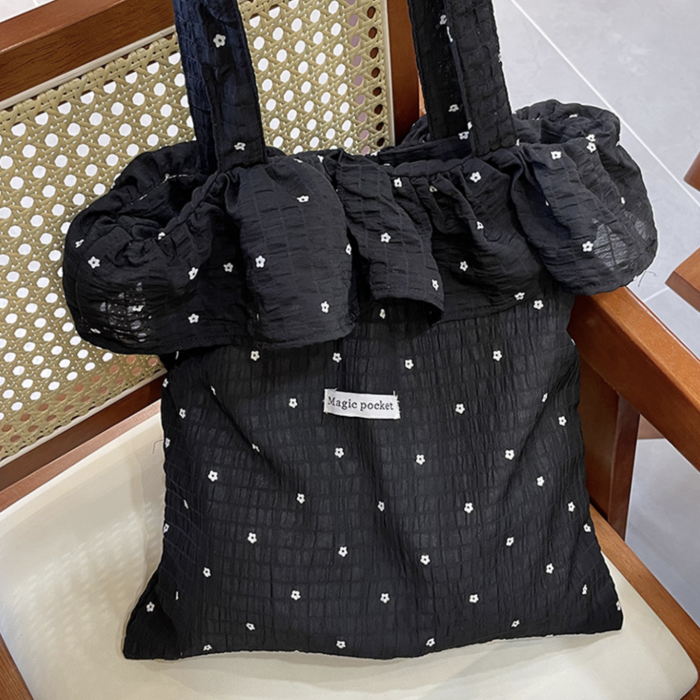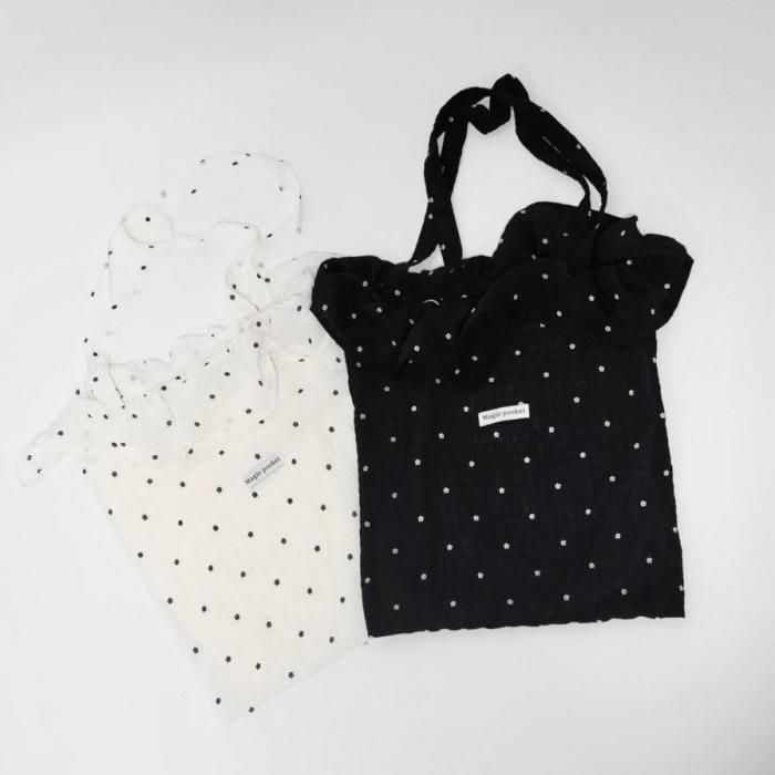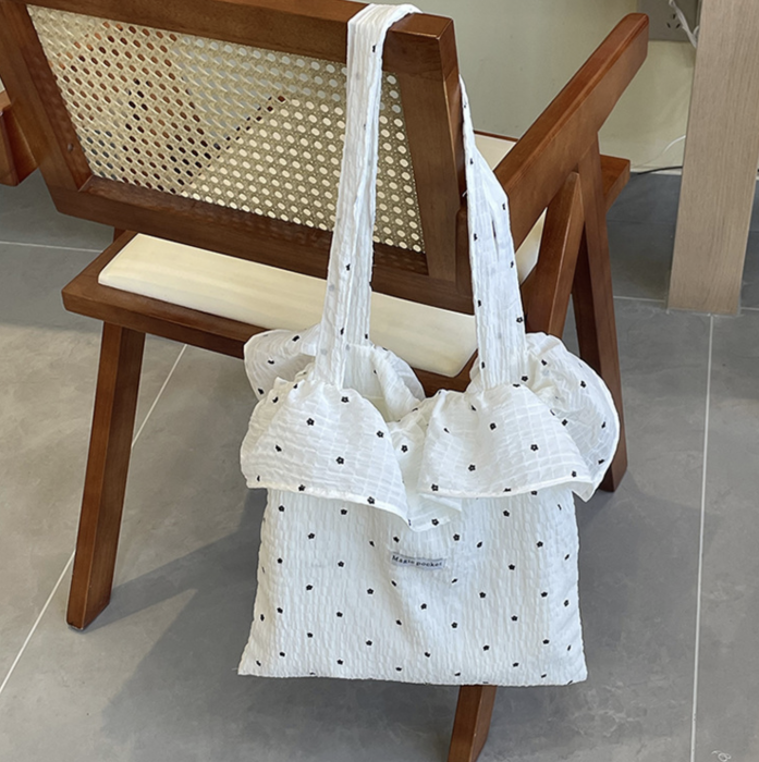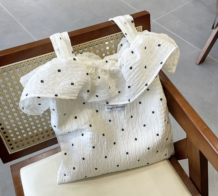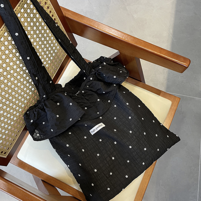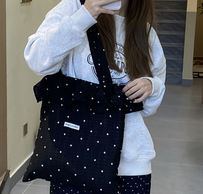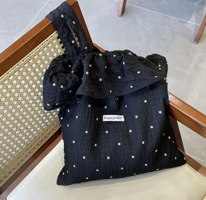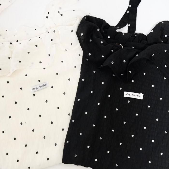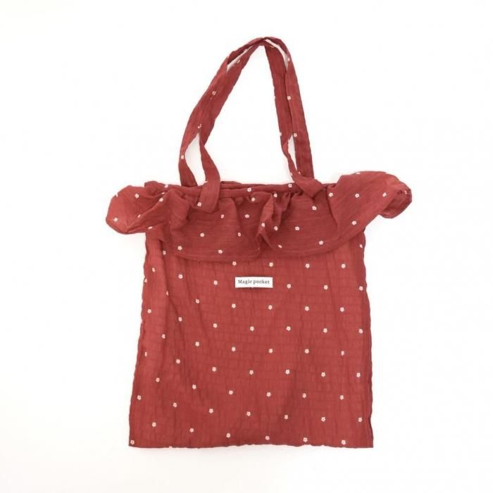 小花柄とフリルがレディライクなトートバッグ。生地はふんわりとしたシフォンのような生地。薄手のトートなので軽いものを入れるのにオススメ。裏地と中にファスナー付きのポケット付き。シフォンフリルが動く度に可愛い