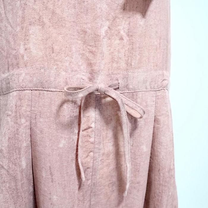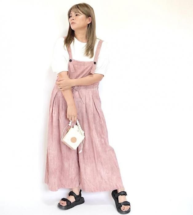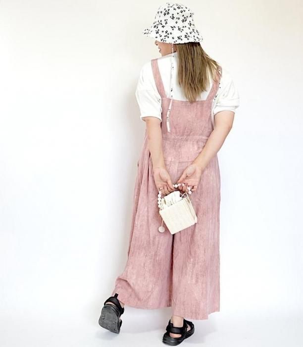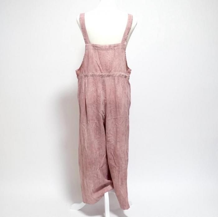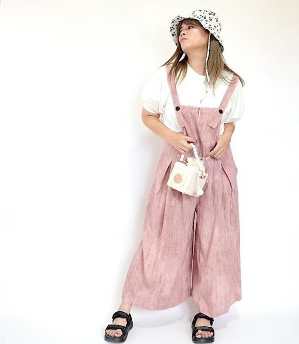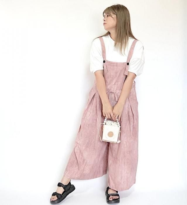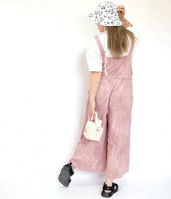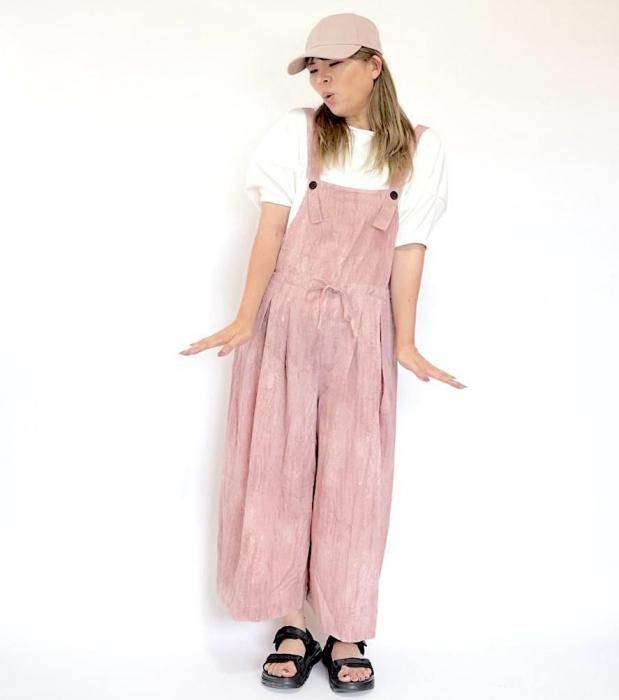 レトロなピンクのサロペットパンツ。染めたようなピンクカラーでツルサラな生地感が着心地が良い。軽くてテロンとしているのでシワになりにくい。ストレスフリーな着心地。細かく見ると、色々な色が混ざり合っているので子供っぽいピンクに見えないから大人可愛く着こなせる。ウエストマーク可能でスタイリッシュにバランス良く見えるのも嬉しいポイント♪タックが入っているので、ややお腹周りも隠してくれる♪