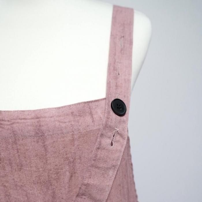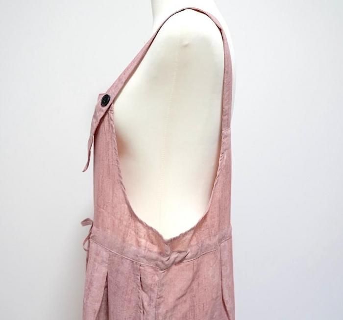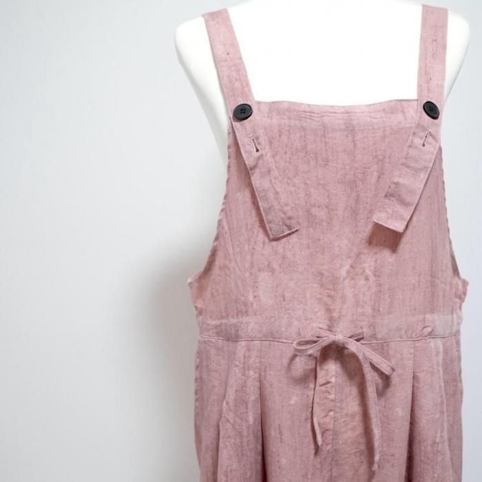 レトロなピンクのサロペットパンツ。染めたようなピンクカラーでツルサラな生地感が着心地が良い。軽くてテロンとしているのでシワになりにくい。