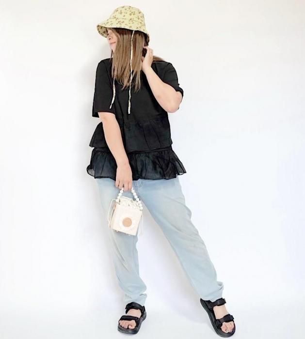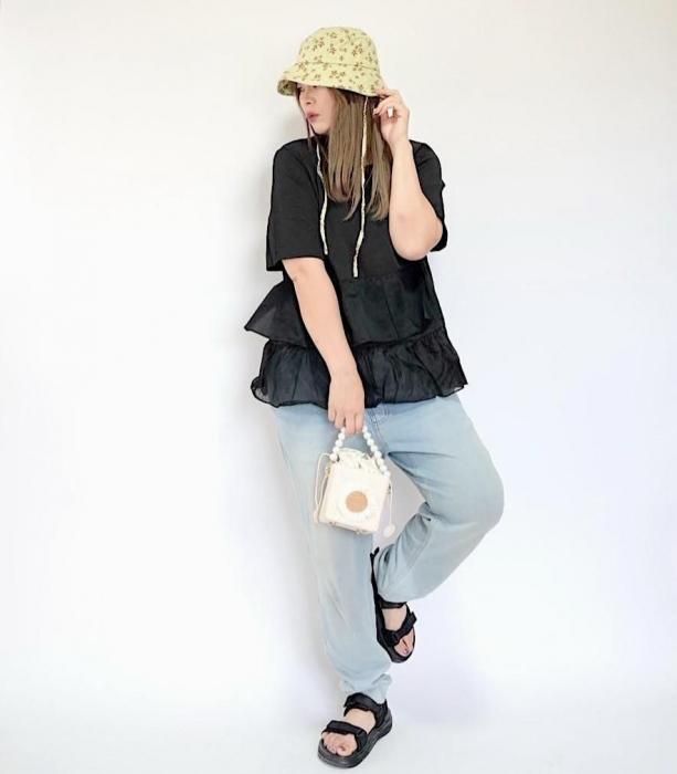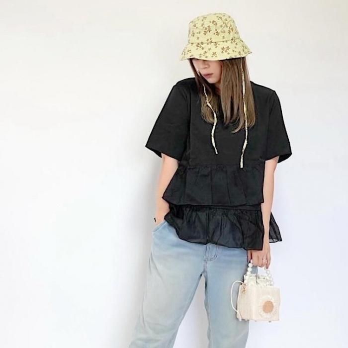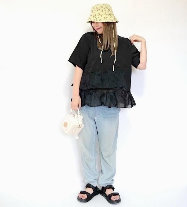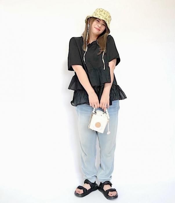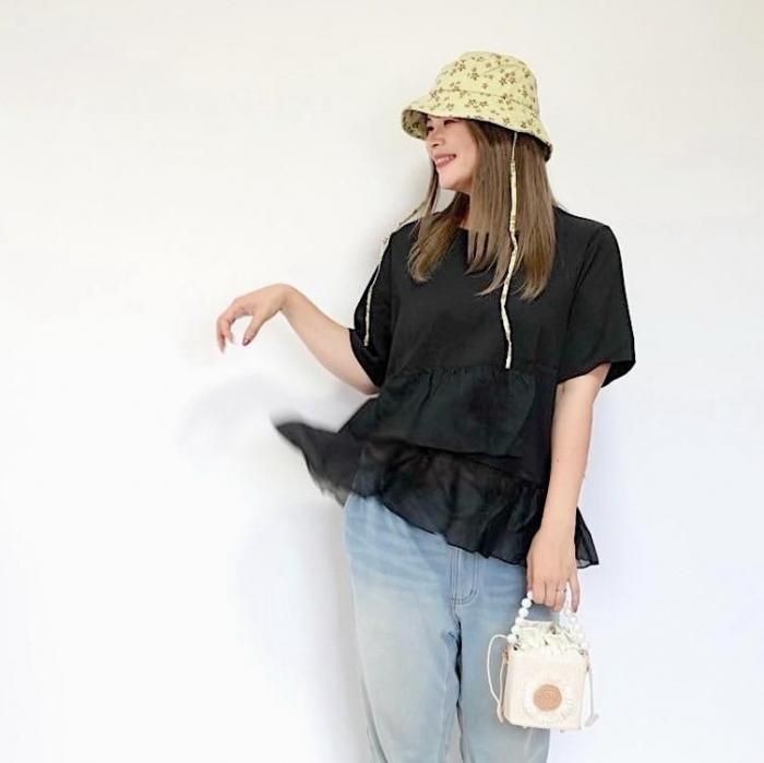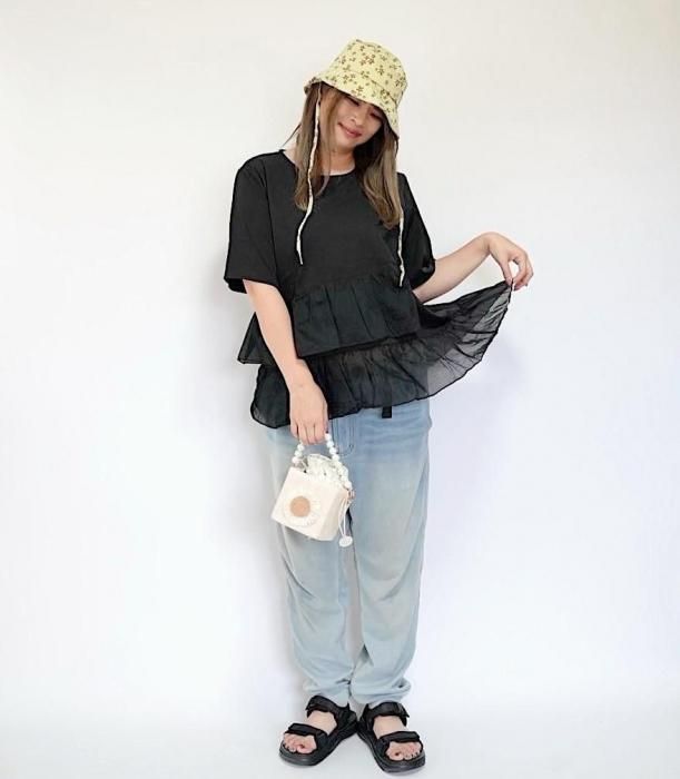 指穴付きのパフ袖フリルトップスで大人か着用して、可愛くなりすぎないサイズ感とカジュアル感に仕上げ、着心地はストレスフリー。ティアードでお腹周りはしっかりカバー。着痩せ効果も!パフ袖で二の腕も細見え効果抜群。