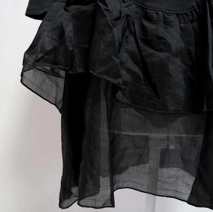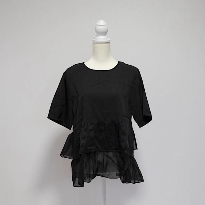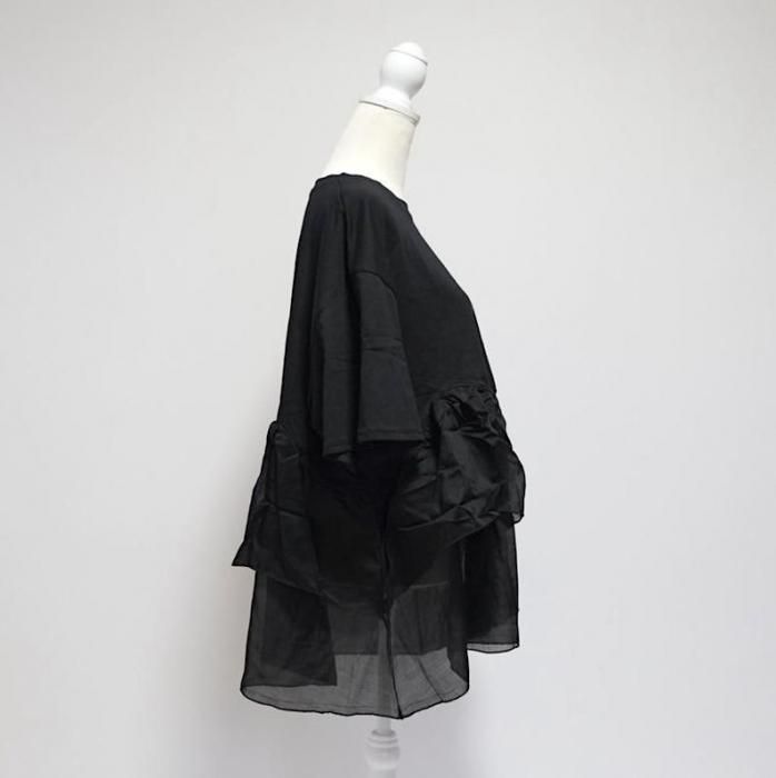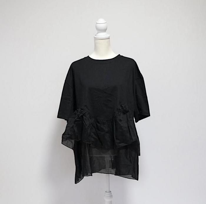 ティアードフリルがボリューミーで可愛いトップス。Tシャツなので着心地も楽チン♪ゆったり着用できるのにオシャレに決まる!