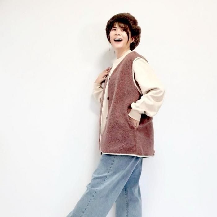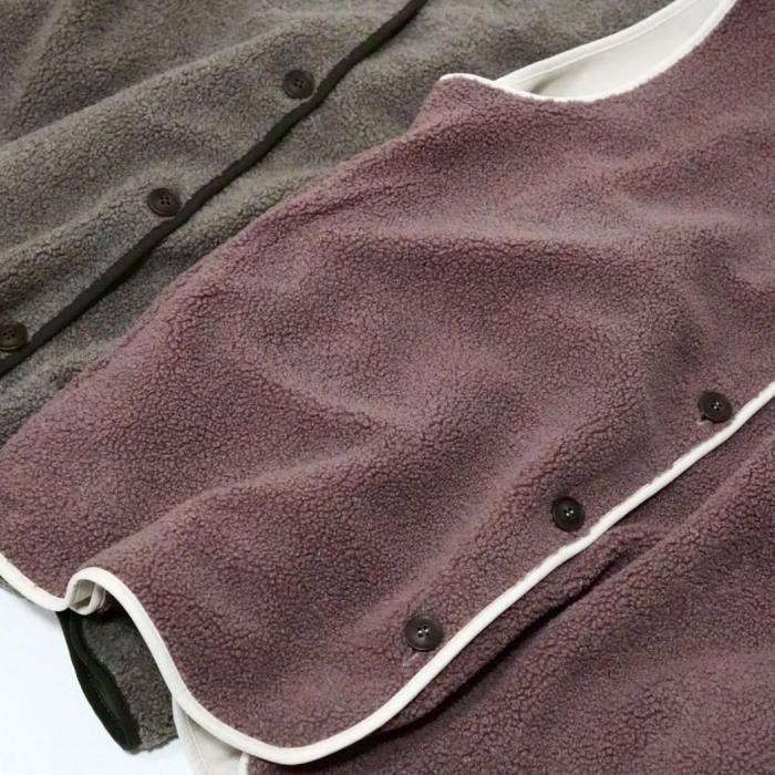 リバーシブルで着用可能なベスト。もこもこ生地とスウェード生地で気分でお好きな方を選んで着用できる。両面共にポケットあり。木製のボタンでナチュラル感な印象に。着心地もゆったりめに着用可能で楽チン、ストレスフリー。スウェード生地の面は撥水加工がされており嬉しい。くすんだ肌馴染みの良いピンクのもこもこ素材のボアとブラウニーケーキのようなグレージュカラーのもこもこボアが暖かい。アウトドアにも普段用にもぜひ。