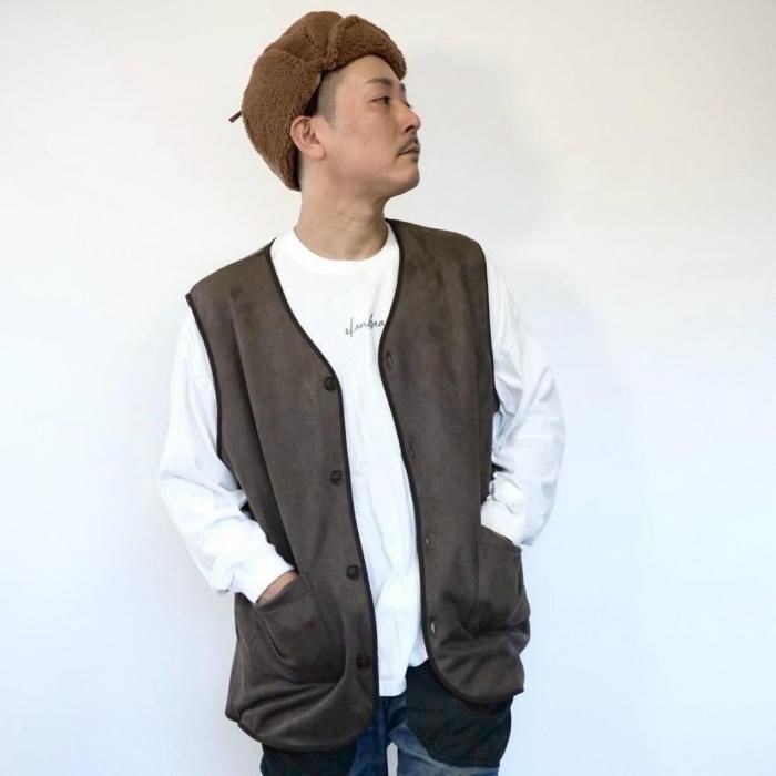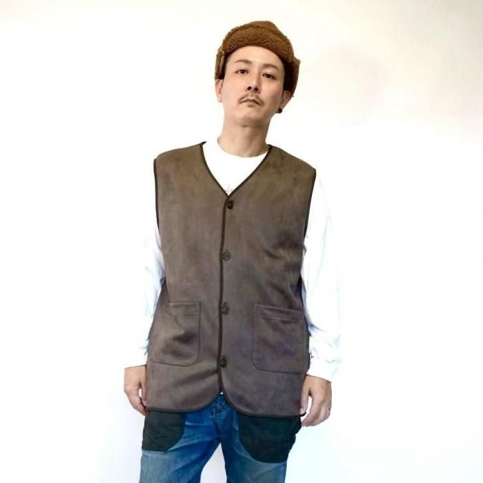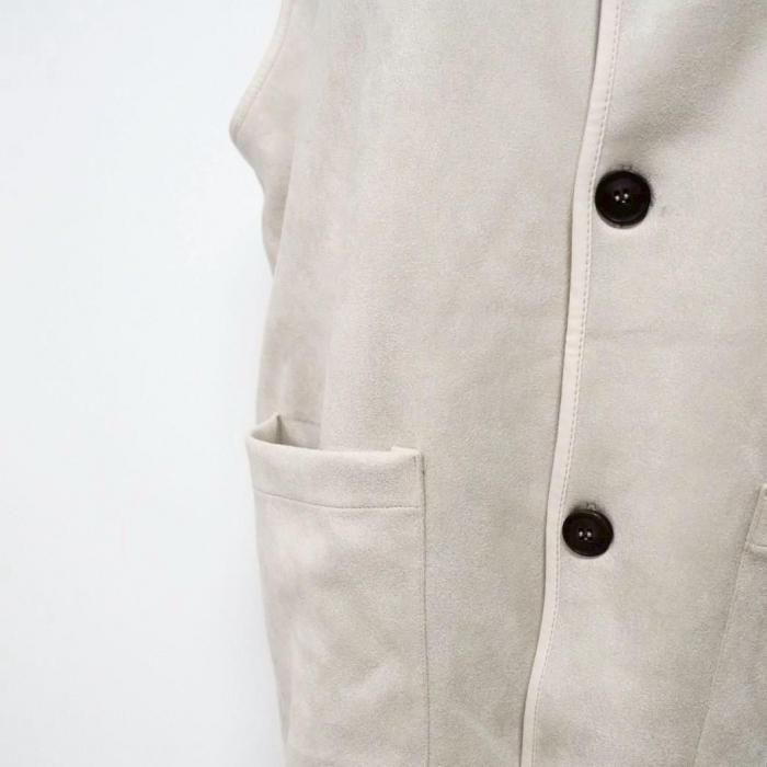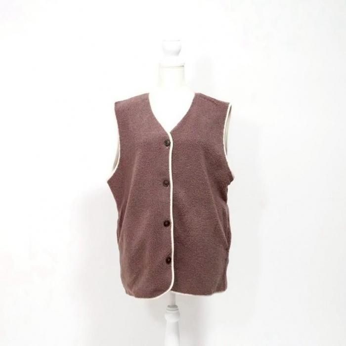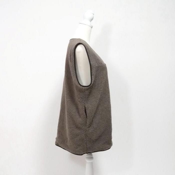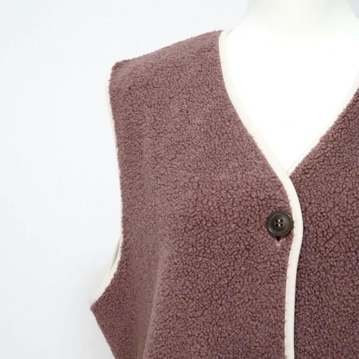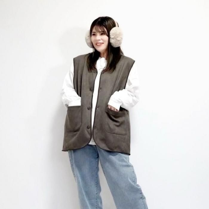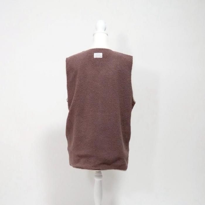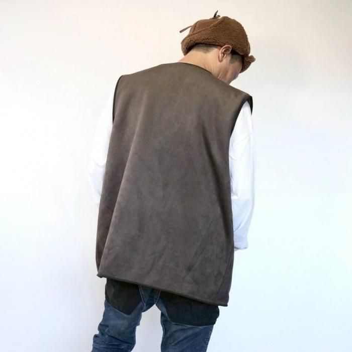 リバーシブルで着用可能なベスト。もこもこ生地とスウェード生地で気分でお好きな方を選んで着用できる。両面共にポケットあり。木製のボタンでナチュラル感な印象に。