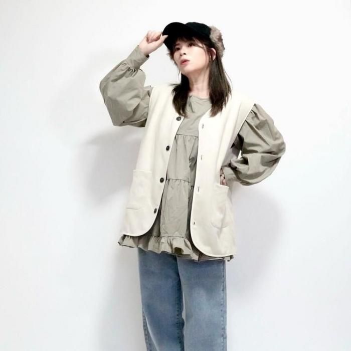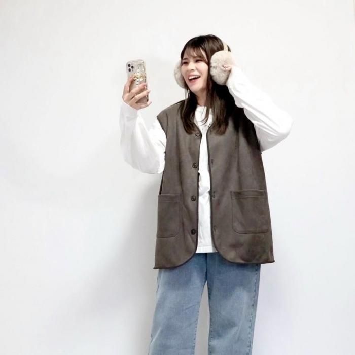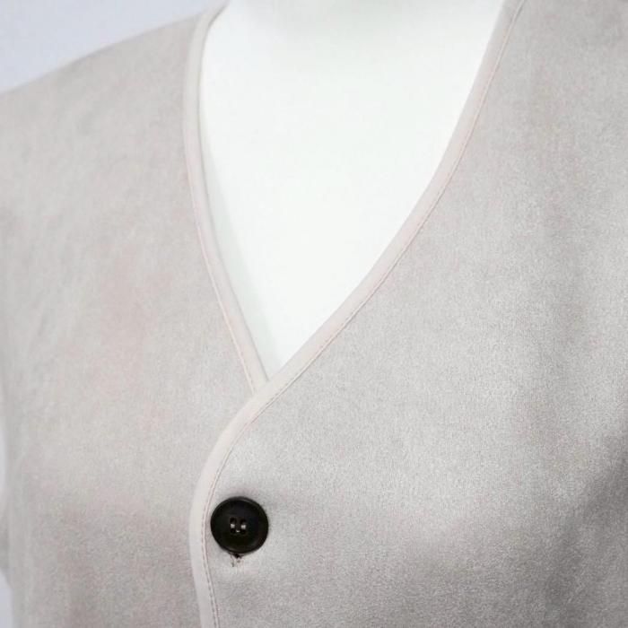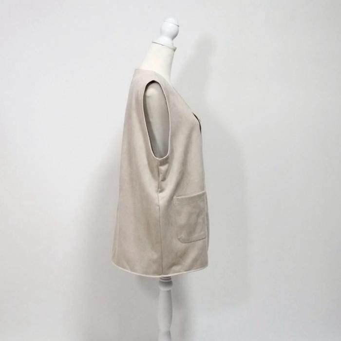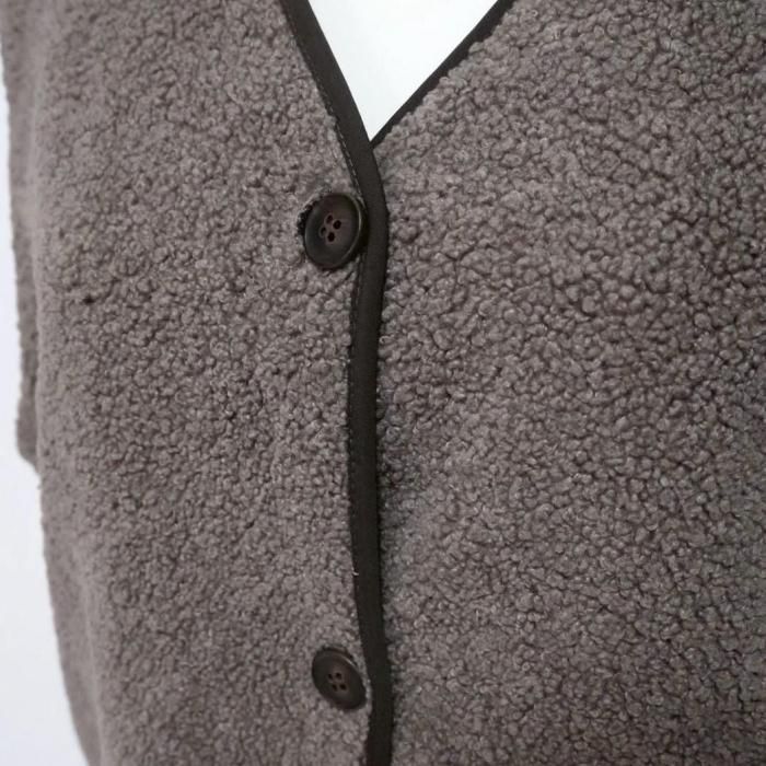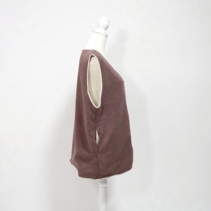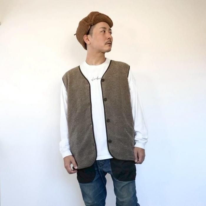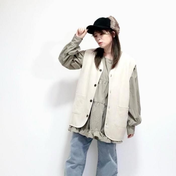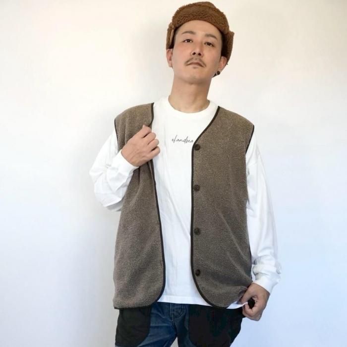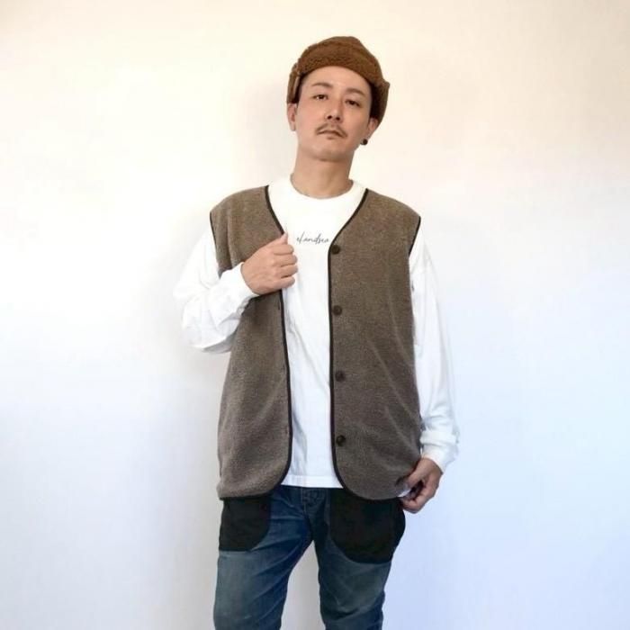 リバーシブルで着用可能なベスト。もこもこ生地とスウェード生地で気分でお好きな方を選んで着用できる。両面共にポケットあり。木製のボタンでナチュラル感な印象に。